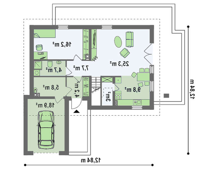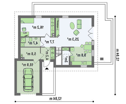 Дом с мансардой и фронтальным гаражом - отличное решение жилищного вопроса для большой семьи, состоящей из нескольких поколений. В проекте учтены все потребности членов семейства. А удачное сочетание приватных зон и больших общих помещений дает возможность жильцам с максимальным комфортом разместиться в доме.