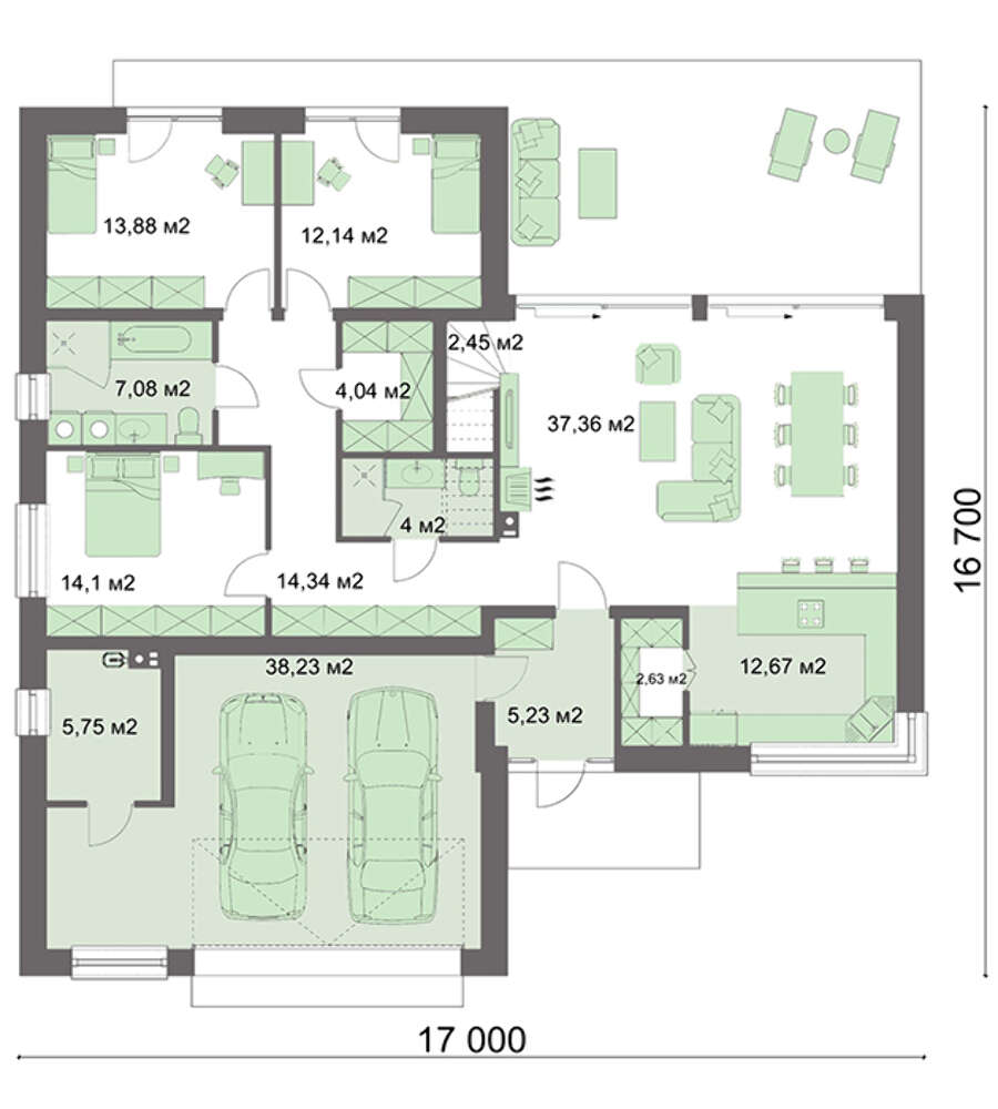 Проект содержит три раздела – Архитектурный, Конструктивный и Инженерный: водоснабжение, отопление, вентиляция, канализация, электроснабжение (приобретается за дополнительную плату) + Пояснительная записка.