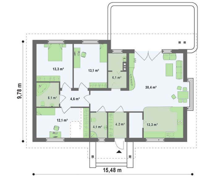 Проект содержит три раздела – Архитектурный, Конструктивный и Инженерный: водоснабжение, отопление, вентиляция, канализация, электроснабжение (приобретается за дополнительную плату) + Пояснительная записка.