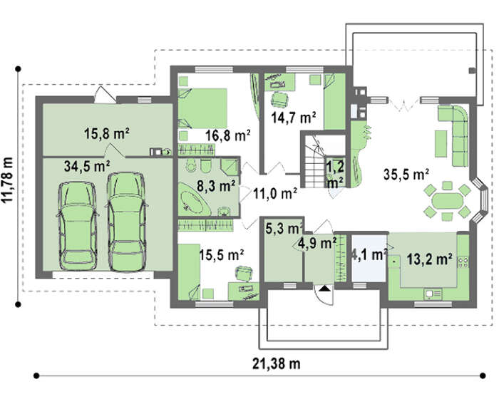 Проект содержит три раздела – Архитектурный, Конструктивный и Инженерный: водоснабжение, отопление, вентиляция, канализация, электроснабжение (приобретается за дополнительную плату) + Пояснительная записка.
