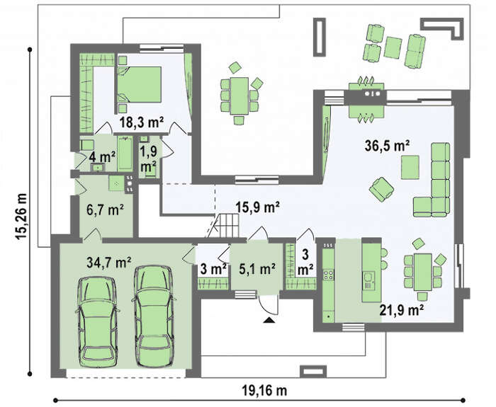 Проект содержит три раздела – Архитектурный, Конструктивный и Инженерный: водоснабжение, отопление, вентиляция, канализация, электроснабжение (приобретается за дополнительную плату) + Пояснительная записка.