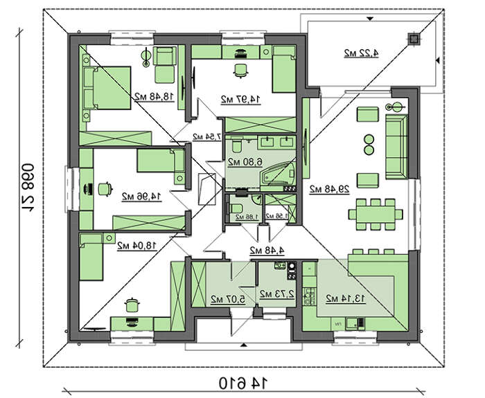 Проект содержит три раздела – Архитектурный, Конструктивный и Инженерный: водоснабжение, отопление, вентиляция, канализация, электроснабжение (приобретается за дополнительную плату) + Пояснительная записка.