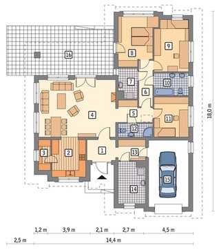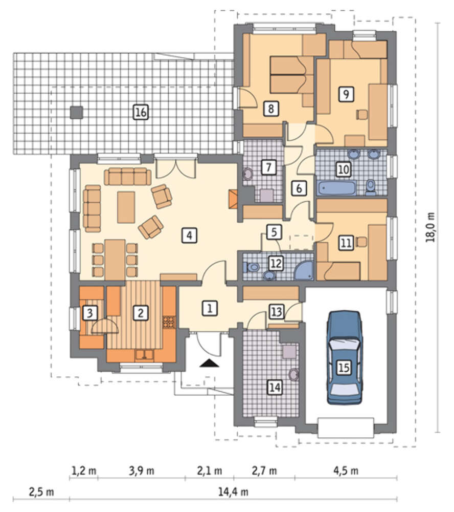 Проект содержит три раздела – АрхитектурныйКонструктивный и Инженерный: водоснабжение, отопление, вентиляция, канализация, электроснабжение (приобретается за дополнительную плату) + Пояснительная записка.