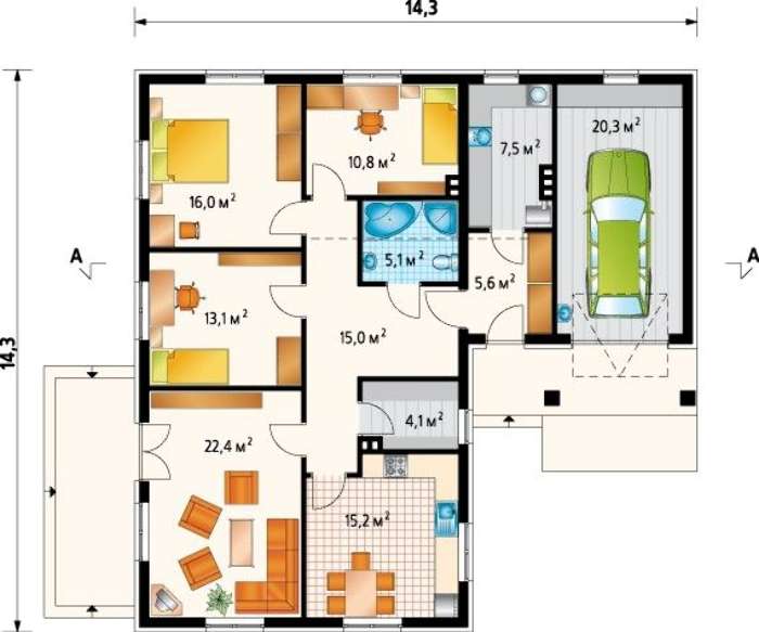 • 4M3496 Одноэтажное строение с гаражом удобной планировки