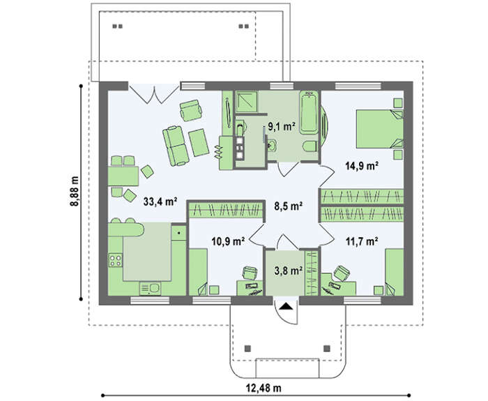 Одноэтажный коттедж 4M458 без веранды, на крыше расположен чердак. Над дверью навесной козырек, который является надежной защитой от дождя и снега.