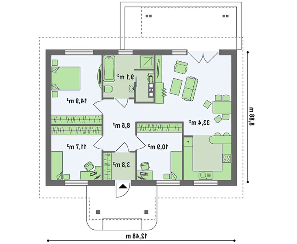 Одноэтажный коттедж 4M458 без веранды, на крыше расположен чердак. Над дверью навесной козырек, который является надежной защитой от дождя и снега.