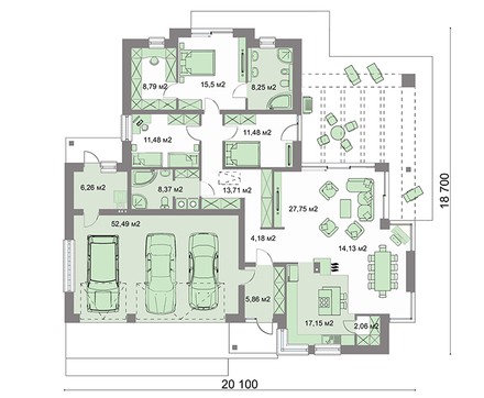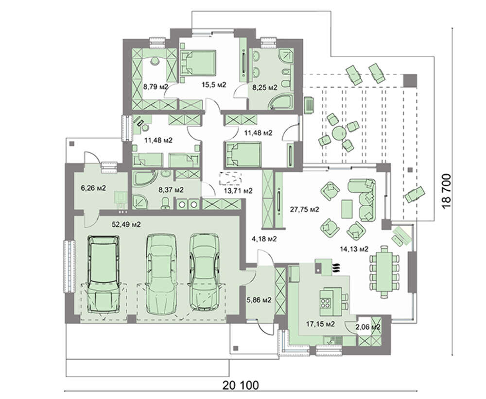 • 4M387 Одноэтажный дом с гаражом на три машины жилой площадью свыше 100 квадратов