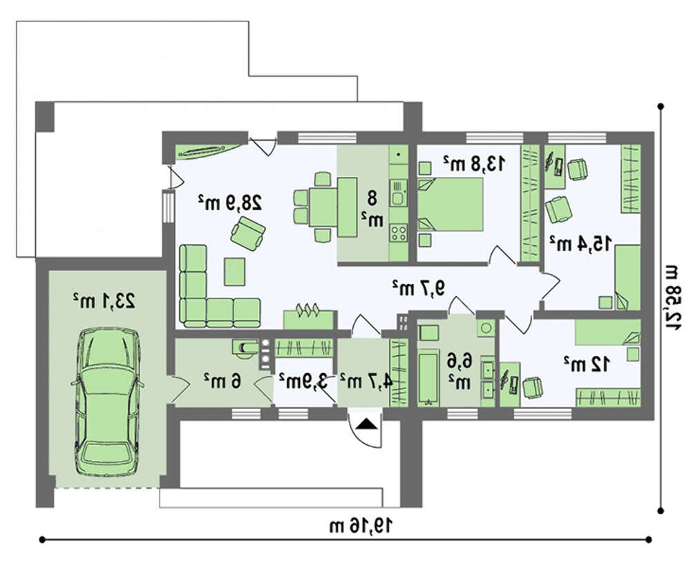 • 4M440a Одноэтажный классический коттедж для узкого участка площадью 130 m²