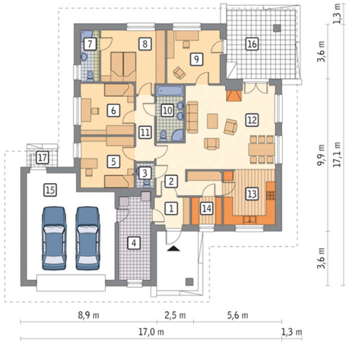 Проект содержит три раздела – Архитектурный, Конструктивный и Инженерный: водоснабжение, отопление, вентиляция, канализация, электроснабжение (приобретается за дополнительную плату) + Пояснительная записка.