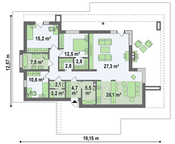В проекте реализована идея максимально отделить общую зону от индивидуальных комнат. Это помогает в любое время суток наслаждаться тишиною, что очень важно для детишек и представителей старшего поколения. В это время в гостевой зоне можно принимать многочисленных гостей, слушать громкую музыку, любоваться на каминные блики и печь вкусные пироги. Изолированности помогает предусмотренные в здании три отдельно расположенных выхода ведущих на разные веранды. Никто никому не помешает. Под одной крышею одноэтажного модернового дома для узкого участка это возможно.