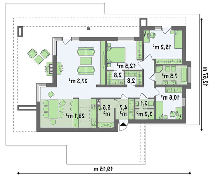 В проекте реализована идея максимально отделить общую зону от индивидуальных комнат. Это помогает в любое время суток наслаждаться тишиною, что очень важно для детишек и представителей старшего поколения. В это время в гостевой зоне можно принимать многочисленных гостей, слушать громкую музыку, любоваться на каминные блики и печь вкусные пироги. Изолированности помогает предусмотренные в здании три отдельно расположенных выхода ведущих на разные веранды. Никто никому не помешает. Под одной крышею одноэтажного модернового дома для узкого участка это возможно.