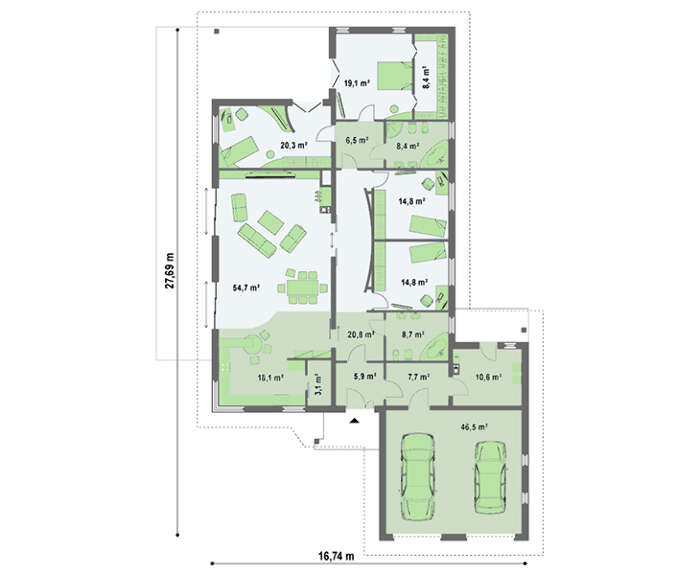 Проект содержит три раздела – Архитектурный, Конструктивный и Инженерный: водоснабжение, отопление, вентиляция, канализация, электроснабжение (приобретается за дополнительную плату) + Пояснительная записка.