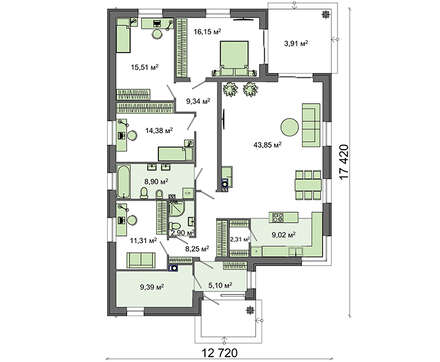 • 4M152 Одноэтажный уютный коттедж с угловой террасой