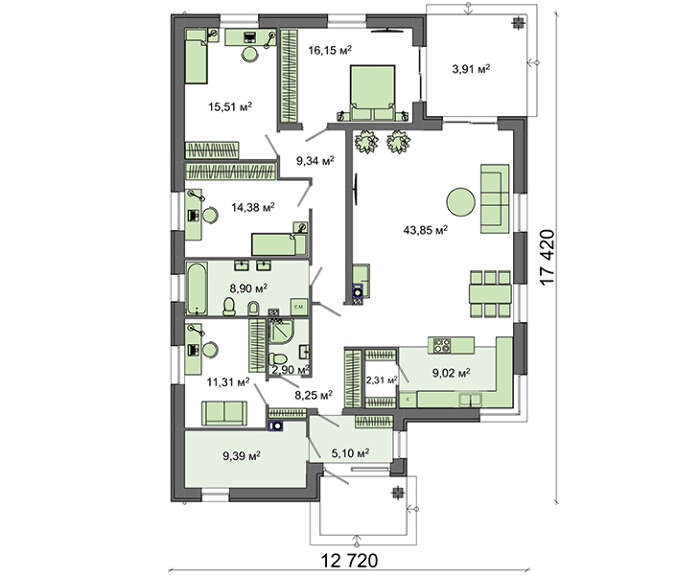 Также возможно изменить конфигурацию и площадь спален в ночной зоне.