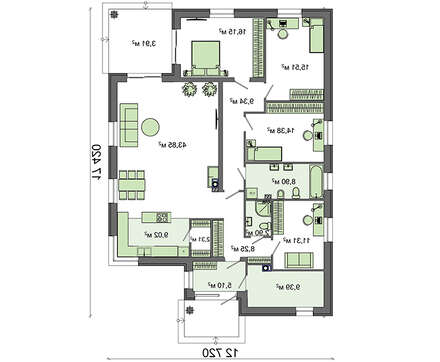 Проект одноэтажного дома с угловой террасой представляет собой уютное семейное жилье с просторной гостиной и тремя спальнями. В принципе, спален может быть и четыре. При необходимости, комната, предназначенная для кабинета, легко становится дополнительной спальней. Причем, с собственным санузлом и душевой.