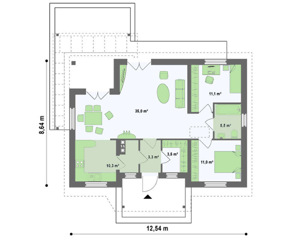 • 4M2335 Небольшой одноэтажный дом с 2-я спальнями