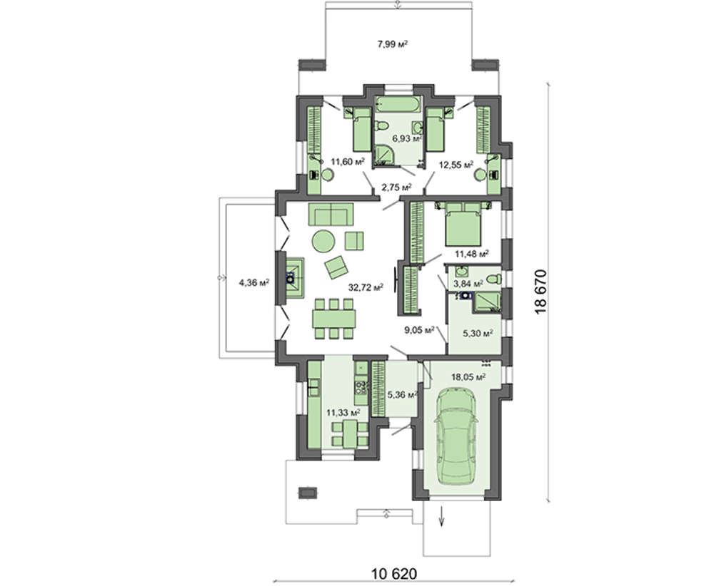 Проект содержит три раздела – Архитектурный, Конструктивный и Инженерный: водоснабжение, отопление, вентиляция, канализация, электроснабжение (приобретается за дополнительную плату) + Пояснительная записка.
