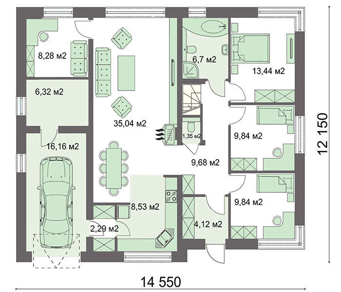 Проект содержит три раздела – Архитектурный, Конструктивный и Инженерный: водоснабжение, отопление, вентиляция, канализация, электроснабжение (приобретается за дополнительную плату) + Пояснительная записка.