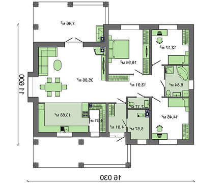 Для экономии площади зона коллективного проведения времени собрана вместе в одну студию. Собственный выход на загородный простор поможет легко переходить на террасу и переносить сюда же часть дружеской встречи. Родственники и гости всегда ценят гулянья среди красивой растительности, рады сорванным фруктам и винограду, а шашлыки вообще принято считать обязательной частью загородного пикника. Для хранения съсных припасов и кухонной бытовой техники определено отдельное, примыкающее к зоне приготовления пищи, помещение.