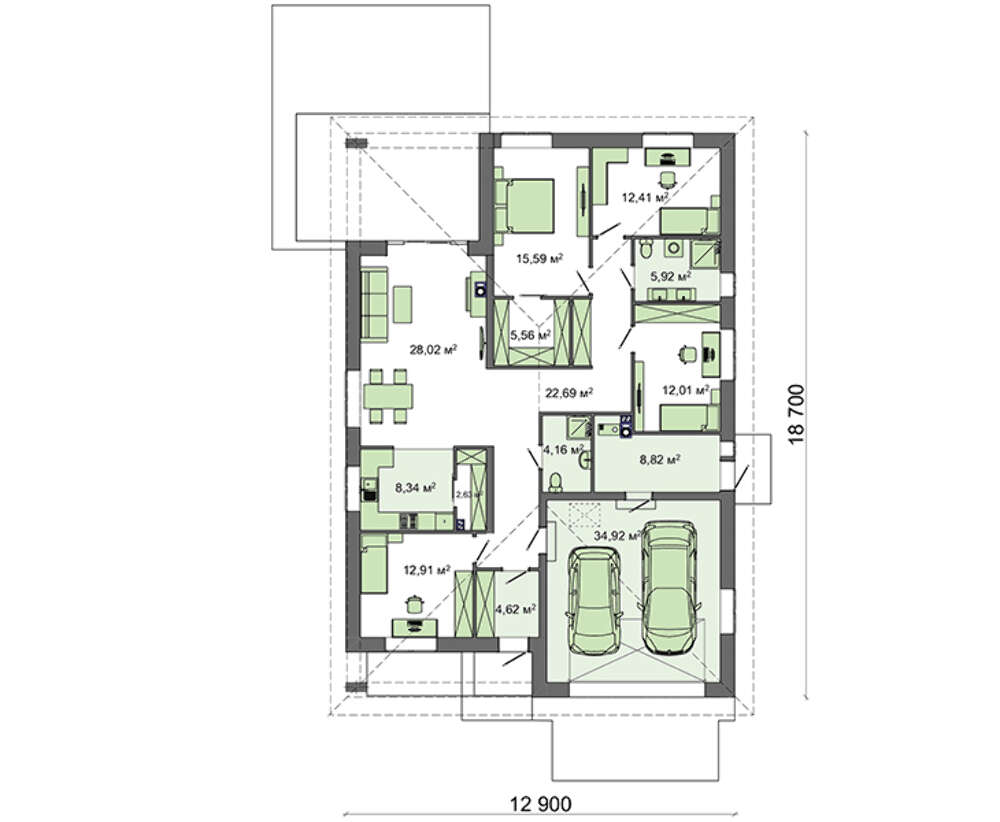 План большого одноэтажного дома со встроенным гаражом на два автомобиля общей площадью 178 кв. м, жилой 80 кв. м