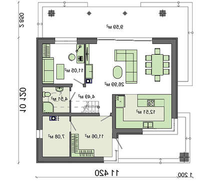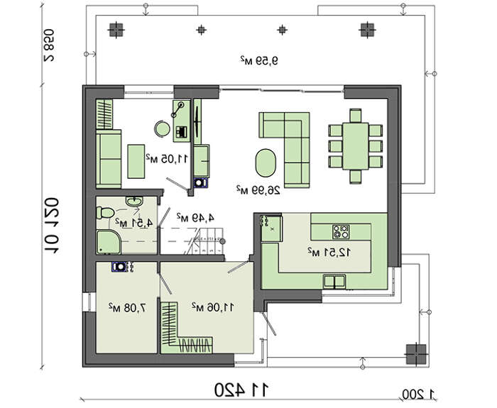 Проект содержит три раздела – АрхитектурныйКонструктивный и Инженерный: водоснабжение, отопление, вентиляция, канализация, электроснабжение (приобретается за дополнительную плату) + Пояснительная записка.
