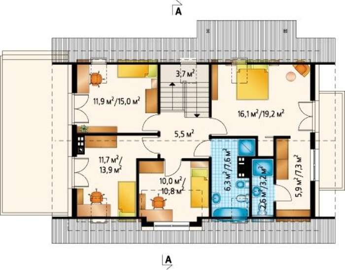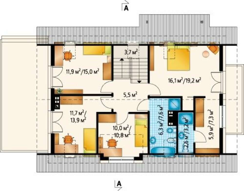 План двухэтажного коттеджа на четыре спальни с гаражом
