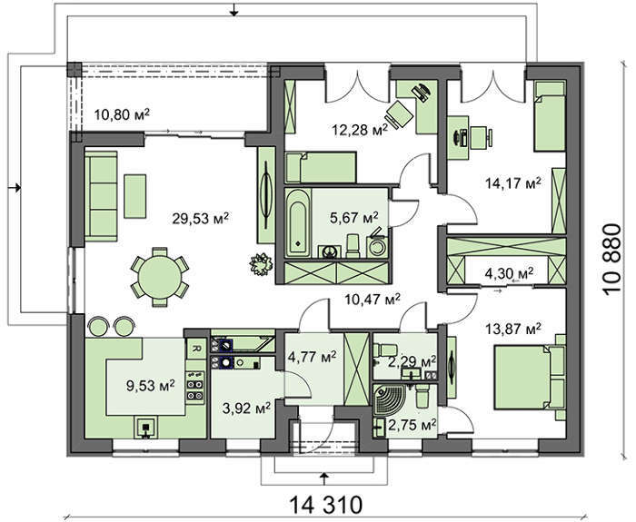 • 4M7107 План коттеджа площадью 124 кв. м для узкого участка