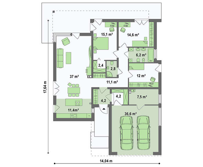 Проект содержит три раздела – Архитектурный, Конструктивный и Инженерный: водоснабжение, отопление, вентиляция, канализация, электроснабжение (приобретается за дополнительную плату) + Пояснительная записка.