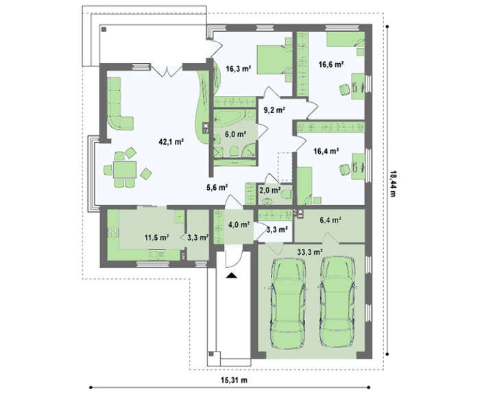 Проект содержит три раздела – Архитектурный, Конструктивный и Инженерный: водоснабжение, отопление, вентиляция, канализация, электроснабжение (приобретается за дополнительную плату) + Пояснительная записка.