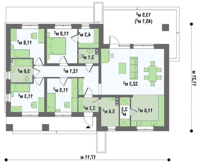 Проект содержит три раздела – Архитектурный, Конструктивный и Инженерный: водоснабжение, отопление, вентиляция, канализация, электроснабжение (приобретается за дополнительную плату) + Пояснительная записка.