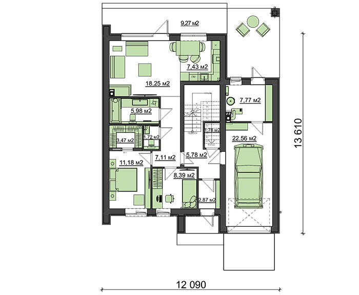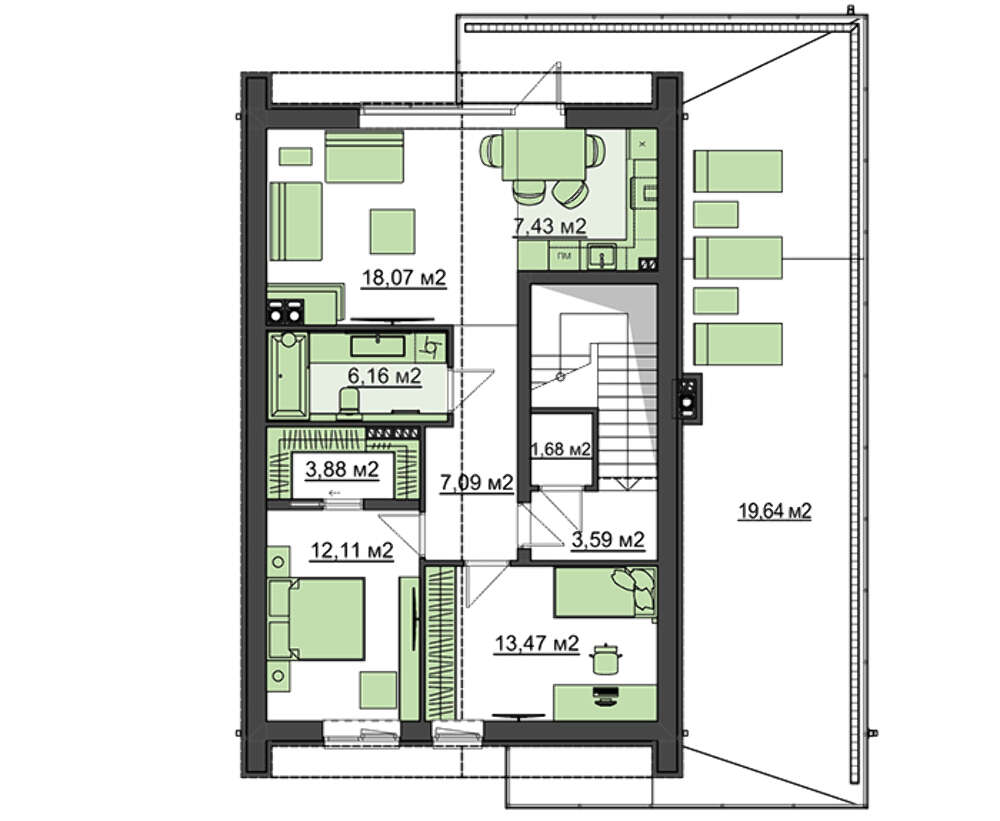 Проект содержит три раздела – Архитектурный, Конструктивный и Инженерный: водоснабжение, отопление, вентиляция, канализация, электроснабжение (приобретается за дополнительную плату) + Пояснительная записка.