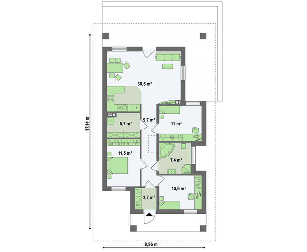 Проект содержит три раздела – Архитектурный, Конструктивный и Инженерный: водоснабжение, отопление, вентиляция, канализация, электроснабжение (приобретается за дополнительную плату) + Пояснительная записка.
