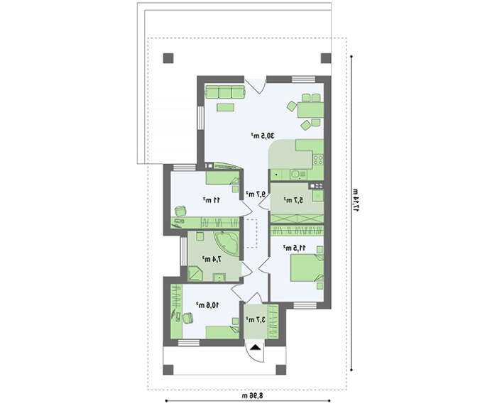Проект содержит три раздела – Архитектурный, Конструктивный и Инженерный: водоснабжение, отопление, вентиляция, канализация, электроснабжение (приобретается за дополнительную плату) + Пояснительная записка.