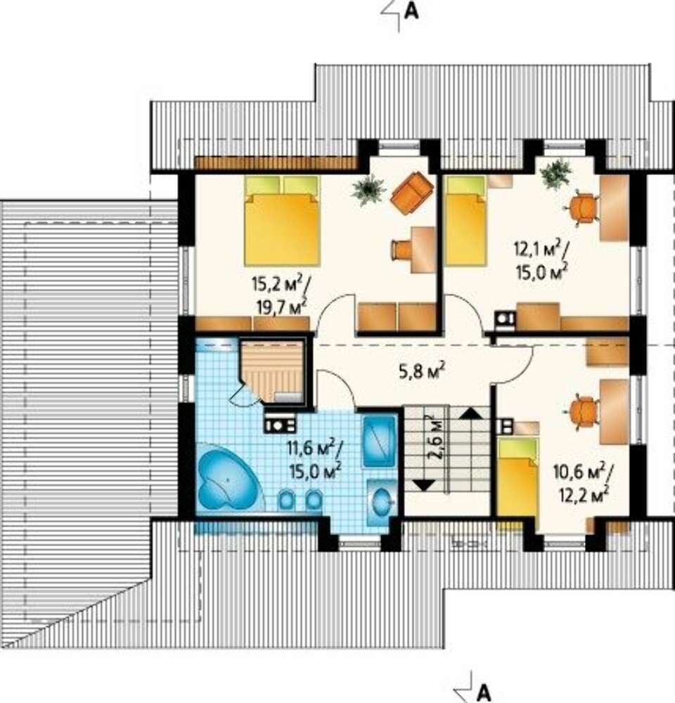 Планировка коттеджа площадью 165 кв.м с деревянным крыльцом и террасой