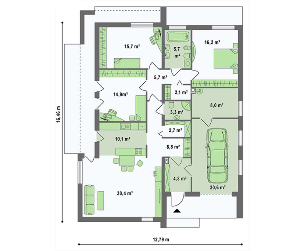 Проект содержит три раздела – Архитектурный, Конструктивный и Инженерный: водоснабжение, отопление, вентиляция, канализация, электроснабжение (приобретается за дополнительную плату) + Пояснительная записка.