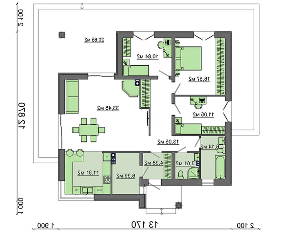 • 4M597 Планировка небольшого дома на 103 кв. м с просторной гостиной, оборудованную камином