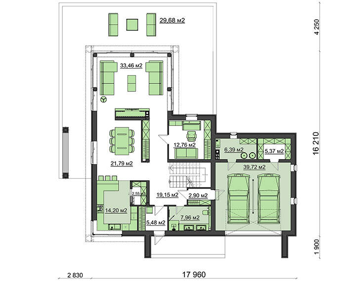 Проект содержит три раздела – Архитектурный, Конструктивный и Инженерный: водоснабжение, отопление, вентиляция, канализация, электроснабжение (приобретается за дополнительную плату) + Пояснительная записка.