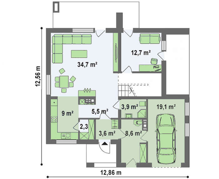 Первый этаж, как положено дружественному строению, наполнен уютом и способствует душевному покою. Он, подобно замку эпохи средневековья, согревается огнем настоящего камина. Полувыделение кухни позволяет запахам съестных припасов и вкусных яств оставаться внутри зоны приготовления. Совместно выполненная с гостиной частью столовая уютно распахивается перед входящими и сразу открывает свои секреты. Особенность планировки первого этажа в возможности уединиться. Здесь предусмотрен отдельный кабинет с выходом на террасу. Спрятанный под крышею дома гараж надежно защищает верный автомобиль от атмосферных неприятностей.