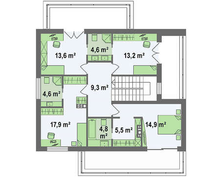 Второй этаж готовит жильцам приятный сюрприз в виде самостоятельных спальных просторов, которых здесь четыре. Все они оборудованы санузлами. Трое из апартаментов имеют уютные, выходящих на разные стороны света балконы. Их изолированность помогает созданию романтического, склонного к мечтанию, настроения.
