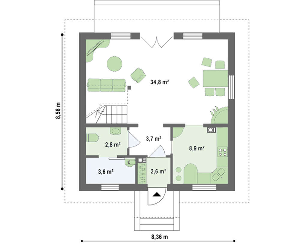 Проект содержит три раздела – Архитектурный, Конструктивный и Инженерный: водоснабжение, отопление, вентиляция, канализация, электроснабжение (приобретается за дополнительную плату) + Пояснительная записка.