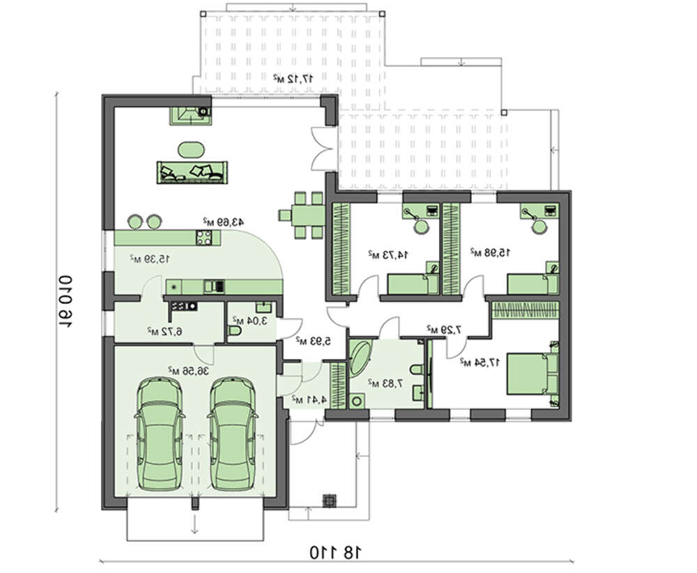 Проект одноэтажного дома с фронтальным гаражом можно без преувеличений назвать оптимальным вариантом загородного жилья для семьи их четырех человек.