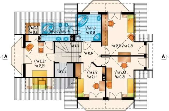 Четыре личных комнаты разнесены на разные стороны второго этажа, максимально уединенные, комнатные и вместительные. Оригинальные по планировке помещения, помогут жильцам выбрать каждому апартаменты под свои потребности и наслаждаться тишиной и красивыми видами, открывающимися с балконного пространства.