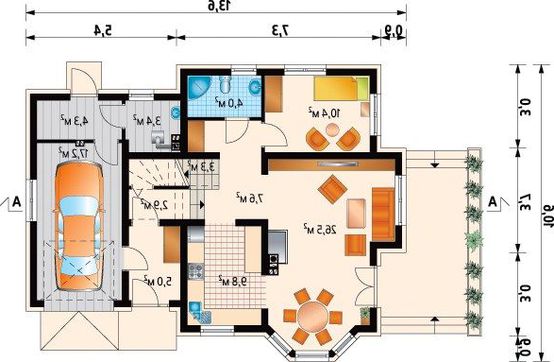 Первый этаж порадует любую семью простором своих хоромов. Небольшое уединенное место выделено под гараж с компактной автомастерской. Гостевое пространство собрано в единое целое, но раздвинуто по зонам в зависимости от назначения. Удобная часть отдана под кухню, небольшую, но достаточной площади чтобы поместить всю необходимую мебель и утварь. Столовое пространство смещено в экер, здесь самое красивое место, наполненное светом и красотами живописной растительности, виды которой врываются через большие окна.
