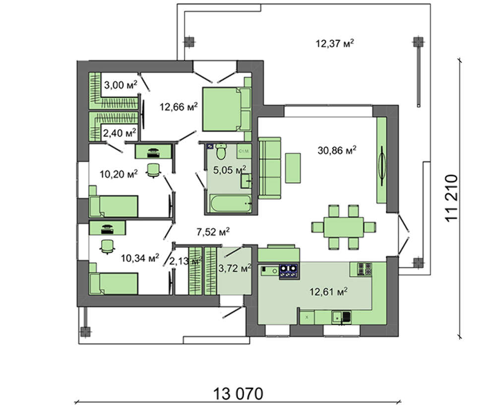 Проект содержит три раздела – Архитектурный, Конструктивный и Инженерный: водоснабжение, отопление, вентиляция, канализация, электроснабжение (приобретается за дополнительную плату) + Пояснительная записка.