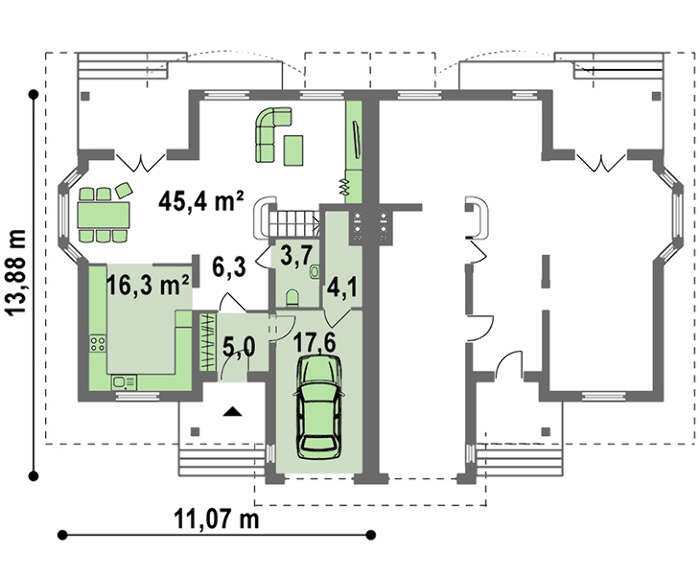 Проект содержит три раздела – Архитектурный, Конструктивный и Инженерный: водоснабжение, отопление, вентиляция, канализация, электроснабжение (приобретается за дополнительную плату) + Пояснительная записка.