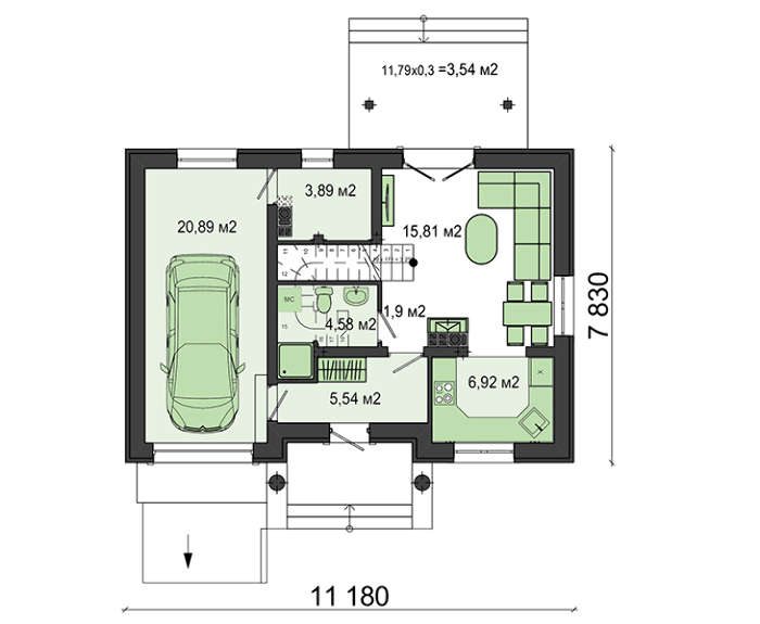 Первый этаж продолжает простор, заданный внешним убранством домовладения. Большая часть отдана под площадь для совместного проведение времени. Размеры гостиной рассчитаны на немалые светские приемы и шумные встречи друзей. Тут же, в отдалении, припрятана кухня, где в комфортных условиях легко приготовится все необходимое для праздничного стола. Заблаговременно предусмотренный выход сразу из гостиной на свободный участок позволит гостям легко маневрировать между помещением и загородным простором.