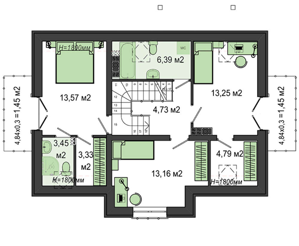 При планировании второго этажа учтена тяга жильцов к свободе. Три большие спальни имеют достаточно места, чтобы расположить все необходимое для отдыха и личной жизни. Ёмкие гардеробные скроют даже большие запасы вещей. Любители романтики могут выбрать одну из двух спален с выходами на балкон, где имеется достаточно места для размещения шезлонга или стола со стульями, чтобы пить ароматные горячие напитки над красивыми пейзажами.