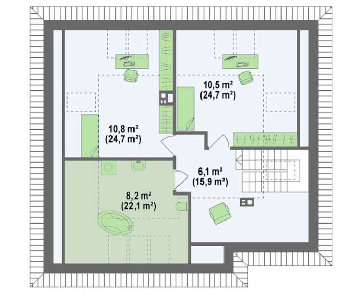 Проект содержит три раздела – АрхитектурныйКонструктивный и Инженерный: водоснабжение, отопление, вентиляция, канализация, электроснабжение (приобретается за дополнительную плату) + Пояснительная записка.