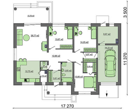 Территорию гостиной в летнее время увеличивают за счет открытой террасы. Сюда выставляют мебель, и все мероприятия проходят на свежем воздухе. Противоположную сторону дома занимает блок технических помещений, состоящий из гаража для хранения автомобиля и котельная, выполняющая функцию мастерской. Остальная площадь дома отдана под прихожую, гардероб, санузел и коридор, обеспечивающий доступ ко всем отдельным комнатам.