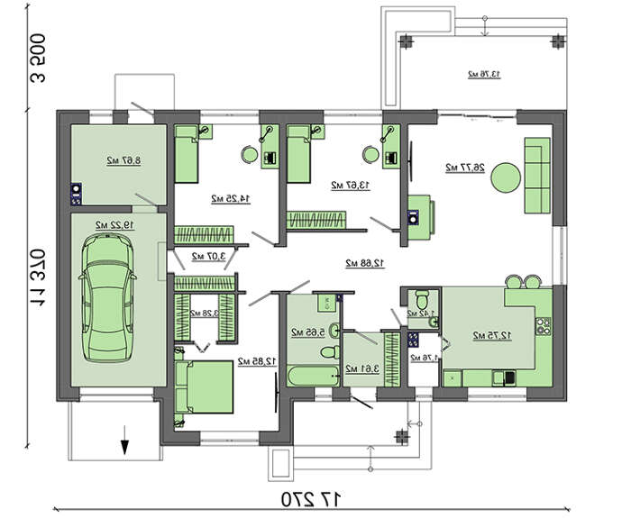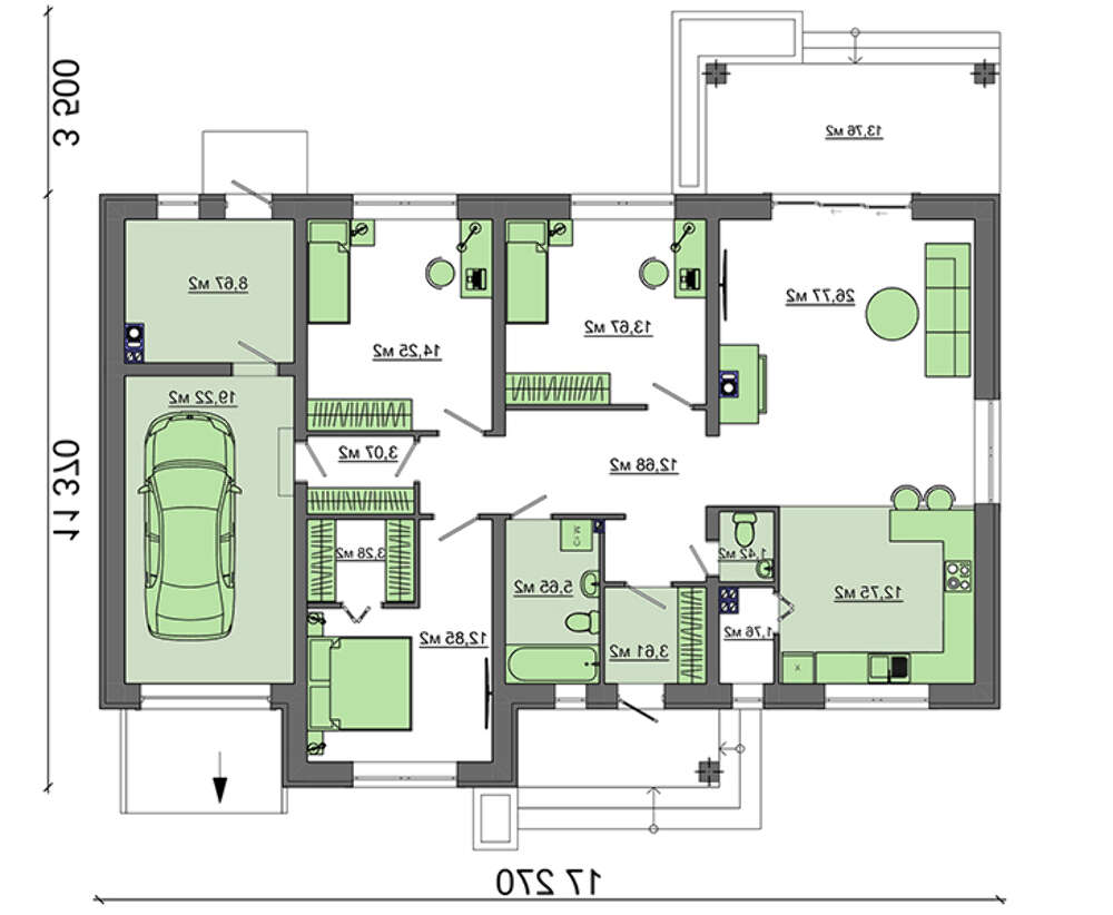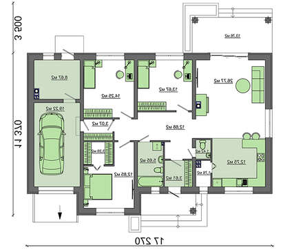 Территорию гостиной в летнее время увеличивают за счет открытой террасы. Сюда выставляют мебель, и все мероприятия проходят на свежем воздухе. Противоположную сторону дома занимает блок технических помещений, состоящий из гаража для хранения автомобиля и котельная, выполняющая функцию мастерской. Остальная площадь дома отдана под прихожую, гардероб, санузел и коридор, обеспечивающий доступ ко всем отдельным комнатам.